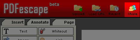 Documents can be shared by clicking the "Share" button on the top of the PDFescape interface.