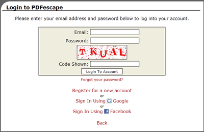(1) Log in to your PDFescape account. If you are an unregistered user, you will need to either complete the setup of your account or logout and then register for a new account.