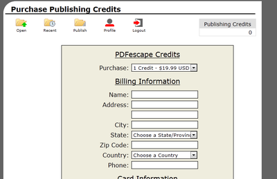 (2) Navigate to the PDF publishing area of your account. There will be a "Publish" icon when in your main account area. If you don't have any "Publishing Credits", click the "Add" button in the upper right hand corner.