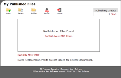 (3) Directly in your PDFescape account you can purchase PDFescape Publishing Credits. 1 Credit will allow a single PDF form or file to be hosted and distributed for one year. There are no per-user, per-click, or pdf-completion fees. If purchasing more than 1 credit, Red Software offers discount pricing. If you are publishing more than 50 files, please contact Red Software for additional pricing information.