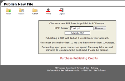 (5) You will then be instructed to upload and publish your PDF form. This will deduct 1 Credit from your account and upload the form to our servers. Please note that once a form is published, it can't be changed, so be sure that the file you're uploading is the form you wish all users to see (complete with all desired form fields, links, modifications, etc.). We recommend opening your form in PDFescape first to confirm the file appears as desired. If you make a mistake, please contact support and we'll be happy to help you out.