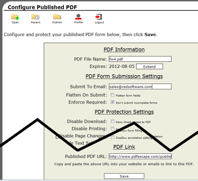(6) Once your file is published, you will be presented with a wide variety of options including where submitted copies of your form should be emailed to (if you wish users to submit forms to you). You can also limit access to certain features including the editing tools available, downloading of the document, printing, and even text selection. To distribute your document the "Published PDF URL" should be used. It can be used on your website, in emails, etc. and is in the format "http://www.pdfescape.com/published/?...".