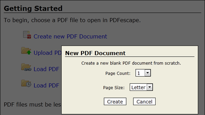 In the PDFescape interface, click the "Create new PDF Document" button, choose the number of pages, and page size, and click "Create". PDFescape will then open this new blank PDF document, ready for content additions with the normal PDFescape tools.